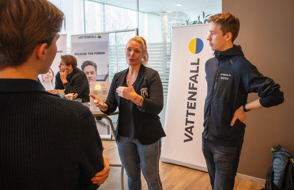 Foto: Anna-Lena Lindskog, Umeå universitet. Bildtext: Under Co-op-dagen på Umeå Universitet träffade Vattenfall Services och andra energibolag många intresserade energiingenjörsstudenter.